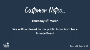 Closed for Private Function, Thursday 5th March from 5PM